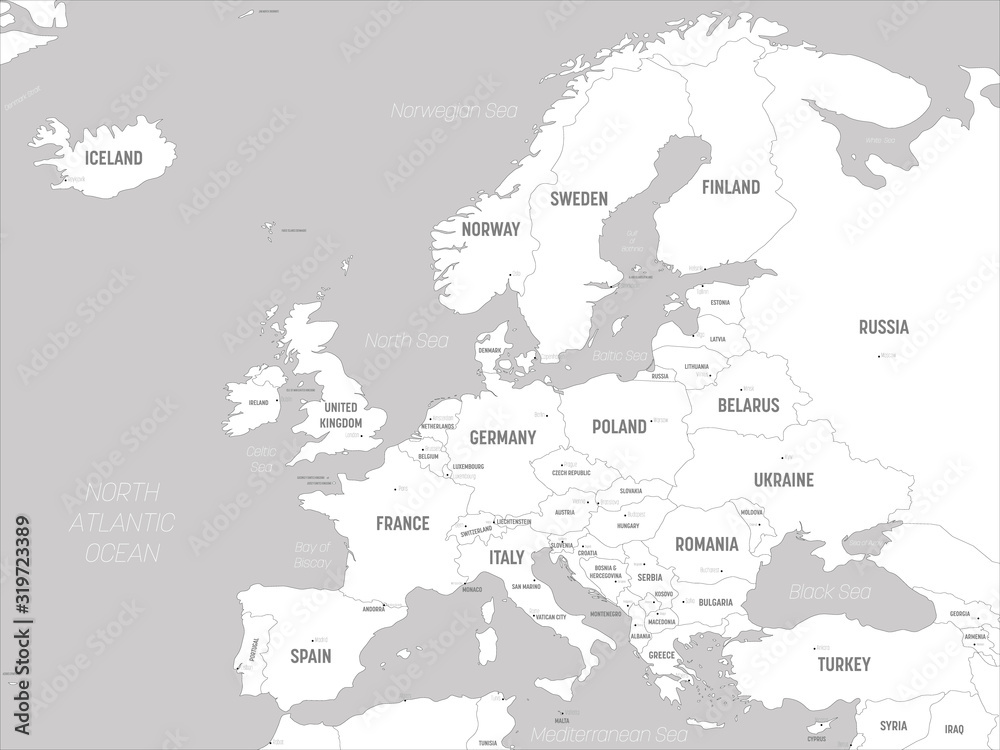Black And White Map Of Europe With Country Names – Discuss the meaning of continent and show and name these on a globe or 2D map of the world. Find out what pupils already know about Europe or any countries within it. Play games using a blow-up . Iceland is one of the least-visited countries in Europe, despite its paradise-like state. With dramatic hot springs, geothermal spas, glaciers, geysers, waterfalls, and black sand beaches .